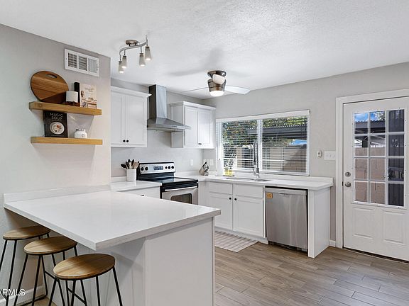 Step inside to find a beautifully updated interior featuring wood-look tile flooring, neutral paint, modern bathrooms and a spacious kitchen. The kitchen boasts white cabinets, quartz countertops, a peninsula island, eat in kitchen and stainless steel appliances. The HVAC system was replaced in 2022. This home comes complete with a refrigerator, washer and dryer and making it truly move in ready.