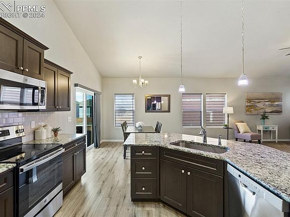This fabulous ranch home offers a seamless blend of comfort and style with its open floor plan, 3 bedrooms on the main floor, 2 full baths, a potential-packed unfinished basement, and generous 3 car garage with service door. The unfinished basement offers endless possibilities for future expansion, whether you dream of a home office, gym, or additional living space. Let your imagination run wild and create the home of your dreams. Step inside to enjoy a spacious and inviting living space, where the kitchen, dining area, and living room flow effortlessly together, creating the perfect environment for entertaining or simply enjoying quality time with loved ones. The kitchen is a focal point of the home, boasting newer appliances and ample counter space for meal preparation. Whether you're cooking for a crowd or a quiet dinner at home, this kitchen has everything you need. The windows are tastefully adorned with layered roller shades by Bali and stay with the home. Head outside to the covered patio, where panoramic mountain views await. You'll also be welcomed to a large fenced-in backyard, perfect for pets to roam freely or for hosting outdoor gatherings with friends and family. Make your way to the relaxing master bedroom en-suite, featuring a luxurious 5-piece master bathroom, complete with a soaking tub and separate shower. For added sustainability, this property is equipped with solar panels that will be paid off at closing and an Electric Vehicle 220V outlet in the garage, providing both environmental benefits and nice cost savings. Stay comfortable year-round with a brand new A/C unit (2023), ensuring a cozy atmosphere all summer long. Don't miss out on this rare opportunity to own a ranch home in Award Winning Academy School District 20 with an open floor plan that effortlessly blends indoor and outdoor living. Schedule a showing today and experience the beauty and tranquility this home has to offer.