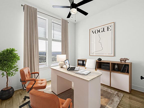 Tasteful finishesHill country viewsOpen floor planDedicated officeSpacious back porchCharming bay windowCorner lot