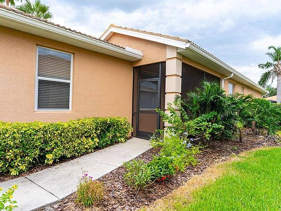 Here is a beautifully maintained, large Villa of 1870 sf under heat/air in the highly desirable Stoneybrook at Heritage Harbour. NO AGE RESTRICTIONS! Showcasing an open layout with two bedrooms, two full bathrooms, a spacious living-cum-dining room combo, office/den, bonus flex room, and an Entertainment wall. The screened, covered back patio leads straight to the water. The HOA maintains the exterior and garden. Stoneybrook is a resort-like community and has top-notch amenities and facilities like an 18-hole golf course, restaurant, Clubhouse, tennis, basketball, pickleball, beach volleyball, etc. Recreation and outdoor living are at the heart of Heritage Harbour. The scenic Central Park offers various sports like Baseball, Soccer, a playground, and a Picnic pavilion. The sprawling Beacon Lake is a favourite spot for cycling, fishing, jogging and relaxing/watching sunset. This green enclave is surrounded by shopping outlets, including Costco, Super Target, Hobby Lobby, Walmart, Home Depot, Whole Foods, Aldi and others. The Heritage Harbour Marketplace also boasts a variety of fine dining options and recreational activities. There are the Sport Academy and Crunch within Heritage Harbour. For more retail options, the Ellenton Premium Outlets are just under 5 miles. The Freedom Elementary School and Carlos E. Haile Middle School are adjacent to Heritage Harbour. There are also schools in the adjoining Lakewood Ranch. It is in an A-rated school district. Located at the junction of I-75 and State Road 64, its residents enjoy easy access to the Tampa International Airport, Sarasota-Bradenton Airport and the UTC Mall in Sarasota. World-class beaches of Anna Maria Island, Siesta Key, and Gulf Beaches are just a short drive away.