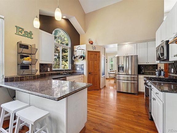 Discover this stunning 4-bedroom, 4-bathroom home in Northwest Arvada! The main floor welcomes you with beautiful wood floors and vaulted ceilings. The sun-soaked dining area is ideal for formal entertaining, while the dual-sided brick fireplace adds warmth and charm to both the living room and the updated kitchen. The kitchen boasts stainless steel appliances, granite counters, white cabinets, and a generous pantry, making it a chef's dream. The main floor also features a luxurious primary bedroom with a 5-piece ensuite, providing a convenient retreat. Step outside to the covered Trex deck, and enjoy the separate garden area with raised beds and mature landscaping. Upstairs, you'll find two generously sized bedrooms and a full bathroom, offering plenty of options for family or guests. The finished basement expands your living space, featuring a large additional living area, space for a home gym, an oversized basement bedroom, an updated full bath, and a spacious storage area. Practicality meets style with a 2.5-car garage and a large mudroom complete with built-ins. Brand new exterior paint and new water heater. Located in the desirable Overlook at Standley Lake neighborhood, this home offers the perfect combination of indoor and outdoor living spaces, making it an exceptional place to call home.