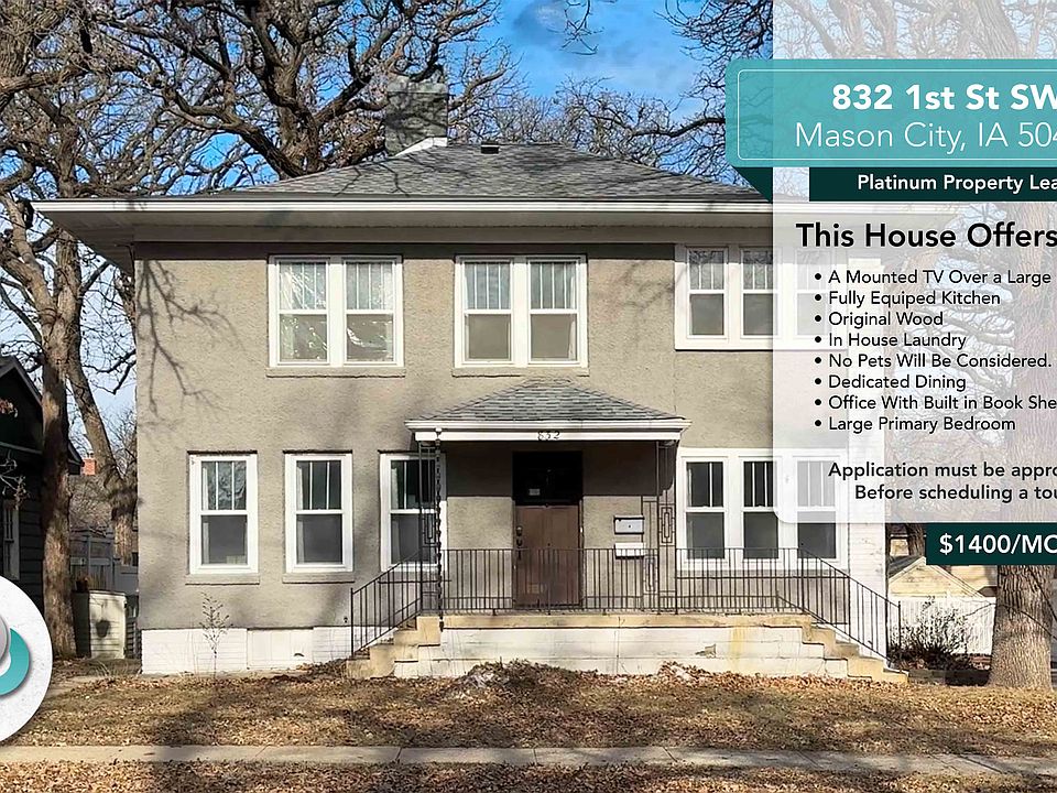 Platinum Property Leasing 1002 E State St NW STE A Mason City, IA 50401 PENDING LEASE Prior to any showings Application must be submitted. Details about the application are listed below. This single family house has original wood features and a cozy fireplace, complemented by a sizeable backyard and a detached one-stall garage. The interior includes a dedicated dining room and a built-in bookshelf ideal for an office setting, while a sunroom adds natural light and warmth. Updated appliances, including a large gas stove and dishwasher, are perfect for cooking enthusiasts. The half-finished basement houses a washer and dryer, and the home offers plenty of space with a full-size bath and generously sized bedrooms. With a shared driveway, this residence combines comfort and functionality. No pets will be considered. - Application Requirement - Be prepared to provide 3 months' worth of proof of income as part of the application process. Renters insurance will be required upon move-in. The following are acceptable documents: 1. Pay Stubs 2. W-2's 3. Tax Returns 4. Bank Statements 5. Social Security Award letters 6. Investment Account Statements 7. Alimony 8. Child support 9. HUD Approval Your supporting documents need to include - Employer Name/ Company - Your Name - Pay period (Current Year) - Net Monthly or annual income