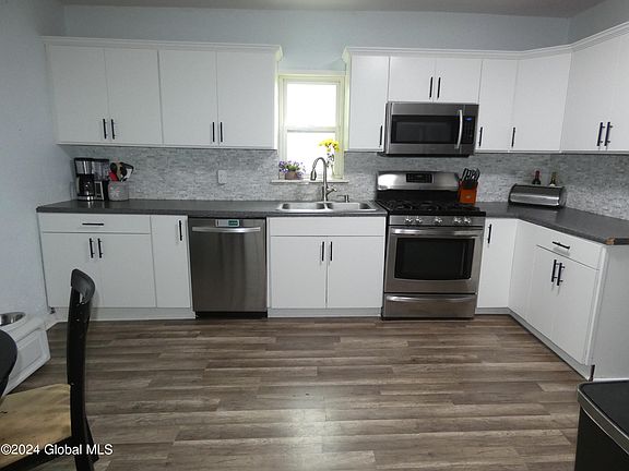 New Roof, Furnace, and recently updated kitchen and bathrooms await you in this 3 bedroom 1.5 bath city home. Expansive bath upstairs includes shower large whirlpool tub, titled floors and newer vanity. Newer Stainless Steel Appliances which include Washer and Dryer, Hardwood and laminatee floors down and carpeting up. Skylight in upstairs hall brightens the upper level space.Walkout unfinished full basement makes for easy accessiblity to gardening tools. Downstairs bedroom currently used as playroom. Very large bedrooms with walk in closets upstairs are perfect for comfort and storage. All this- situated on a very quiet street not far from walking/biking path. Alot of home and amenties for the money. Minutes to Regeneron, Albany, East Greenbush, and I90