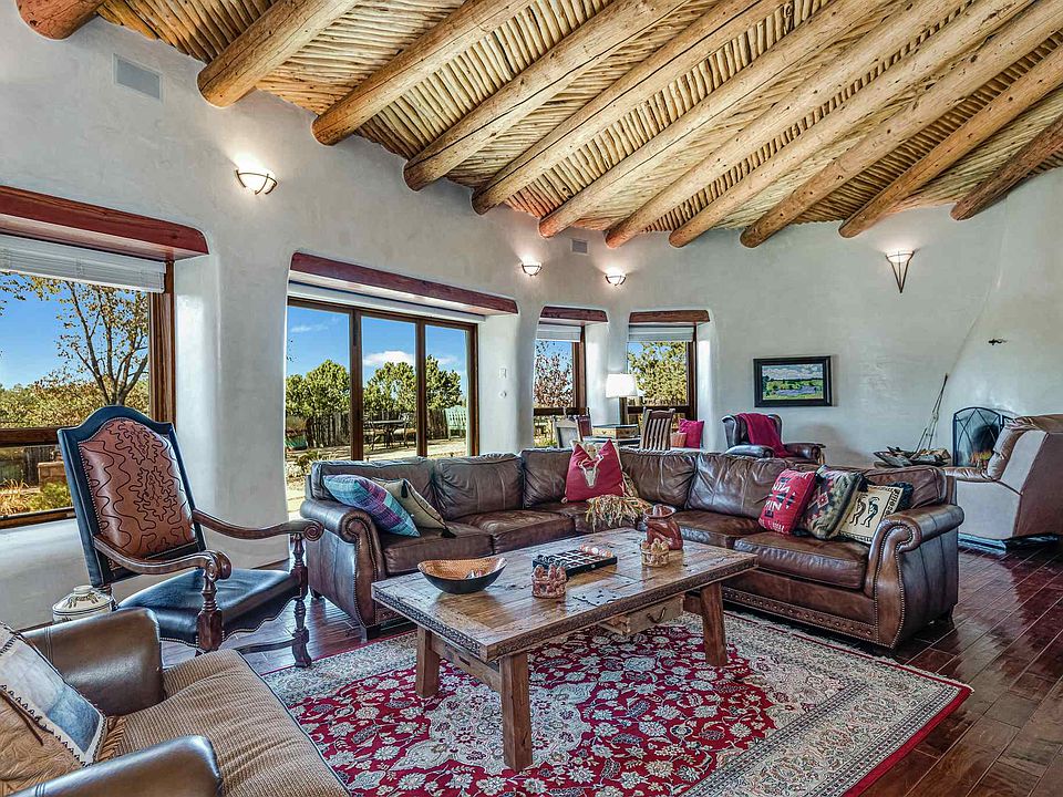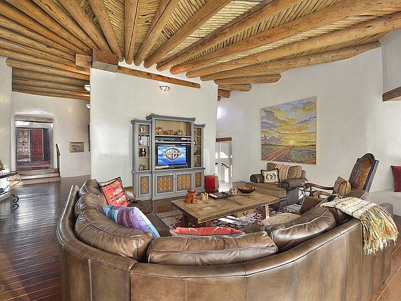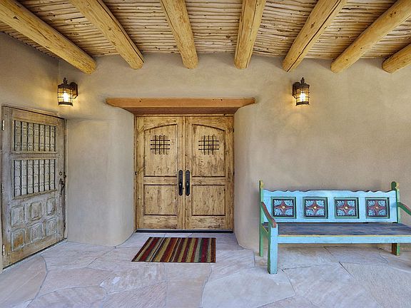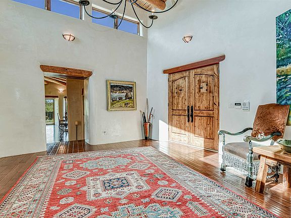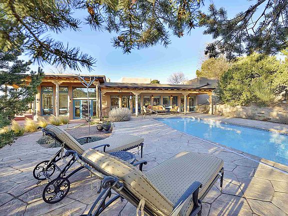 Unique opportunity to own this exceptional 3-bedroom 4-bath gated home on the historic Eastside with views of Santa Fe and the mountains. The craftsmanship is apparent as you enter the hand-carved wooden doors and into the expansive living room. With tall ceilings, Kiva fireplace, picture windows and glass doors allowing natural light, it has ample space to entertain inside and out as it flows into formal dining room with glass doors leading to a covered portal. Enjoy magical evenings on the sunset patio with outdoor hot tub and fire pit. The gourmet kitchen has custom wood cabinetry, granite countertops, stainless steel appliances. Large center Island with breakfast bar, and wine station with wine cooler add to the appeal. Kiva fireplace in the informal dining room creates the perfect atmosphere for intimate meals. An office with a Kiva fireplace is just off the spacious master bedroom with sitting area, and private access to the covered portal and the swimming pool. The serenity continues with a decorative river stone accent wall leading into the spa-like master bathroom with custom wood dual vanity, granite countertops, jetted tub, walk-in steam shower, and walk-in closet. Guests will enjoy the privacy of a 2nd master suite, along with a 3rd bedroom, each with an ensuite bathroom. Viga and coved beam ceilings, wood and tile floors throughout. This quiet retreat seems miles from town but is a short distance to the historic Santa Fe Plaza, Museum Hill, and famed Canyon Road.