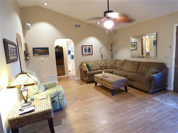AWC - Taking Backup Offers A beautiful home in an exquisite setting! This home is designed for comfortable living inside & has enormous outdoor living space as well. Entire home is light & bright. Kitchen & baths have been updated, granite counter tops, wood cabinets with pull outs & huge lazy susan. Backsplash & several glass front cabinets. Lots of storage & counter space in kitchen. Beautiful wood look ceramic plank flooring in living room, dining room, & master bedroom. Outdoor space has been thoughtfully designed to maximize quality time outside. Fully fenced for privacy with many trees for shade & privacy. Huge lanai offers space for separate seating areas, gas fire pit for chilly nights & ambiance. Large open patio with paver bricks. Home is elevated, back yard is terraced. 2 sheds. Propane gas stove, fire-pit, & tiki torches. Tankless hot water. Exterior paint 2013, gutters. Garage has temporary wall making a 3rd bedroom or office (not permitted). Can be removed to return to garage. Extra parking space in driveway. Voluntary membership to South Venice Ferry and boat ramp.