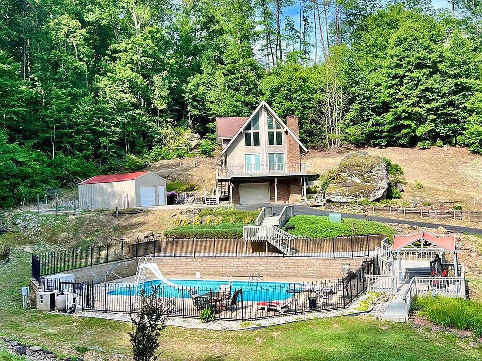 This custom built home is on the market for the first time and is located in Cliffs Edge at Wood Creek Lake. No matter the season this home has much to offer from the warmth from the fireplace in the great room on a cold winters night to the inviting in ground pool for some fun in the sun on a hot summer day. This unique home has an open floor plan with a wall of windows, 3 levels, 3 bedrooms, 2 full bathrooms, granite counter top, stainless steel appliances, walk out basement with garage, plus a detached garage with storage. The views are amazing with Wood Creek Lake across the street, large boulders, trees, and nature at its finest.