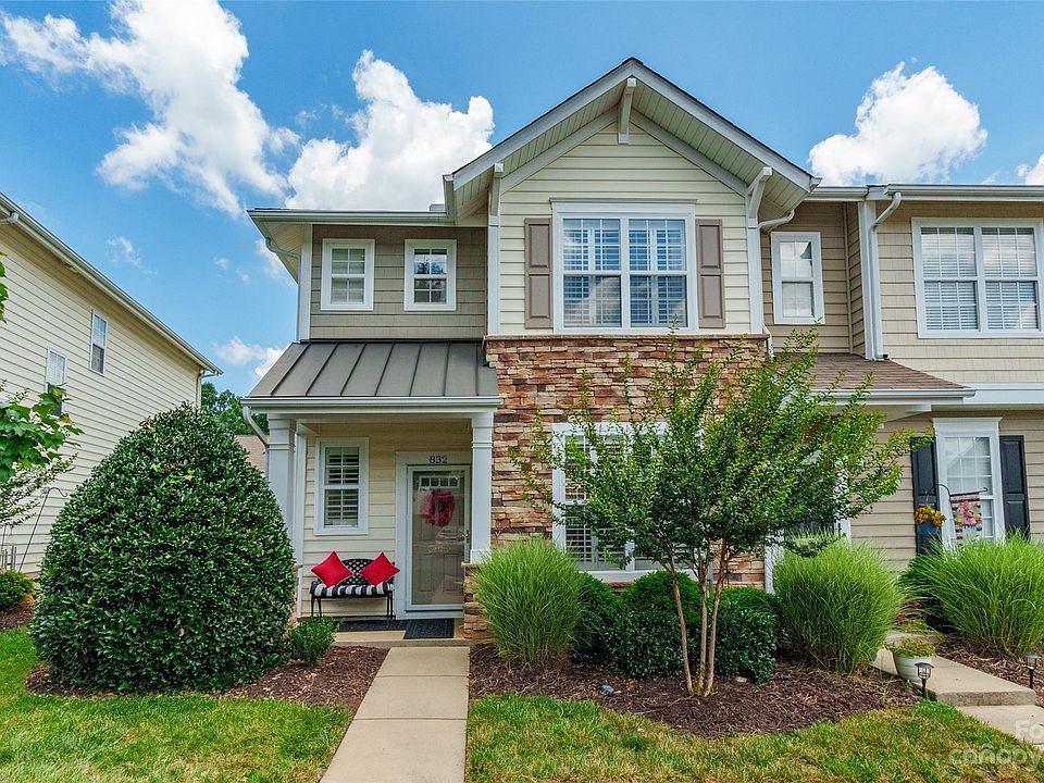 This end unit townhouse is stunning with 3 bedrooms, 2.5 bathrooms. Impeccably maintained and pride of ownership shows! You'll find plantation shutters throughout, glowing natural light to stream through this light and airy, open floorplan. Beautiful luxury vinyl plank flooring throughout main floor. Stainless appliances in this chef's kitchen include gas range and built-in microwave making meal prep super easy and quick! Built in bookcases maximize space and versatility in bedrooms. Located off Highway 160 in Fort Mill, this neighborhood is moments from Tega Cay shopping, dining, the gym, and more! End every day relaxing in the enclosed paver patio, privately while grilling out. The Fieldstone community also has a club house and outdoor pool for residents to enjoy!