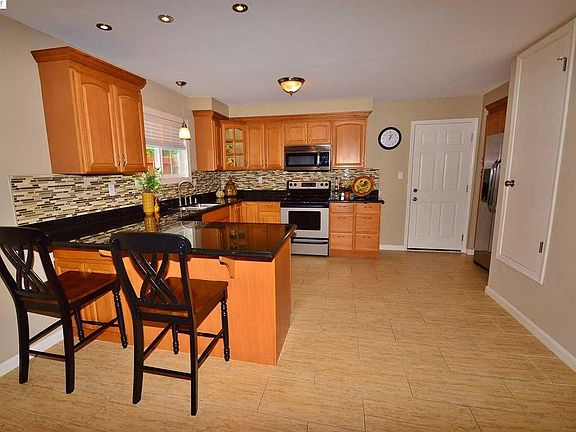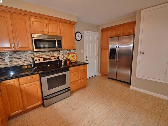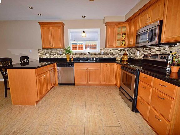 Remodeled Granite kitchen with Stainless appliances, built-in microwave and side by side refrigerator, updated Granite baths with custom tile showers, newer dual pane windows, custom frplce finished garage with ample storage, large backyard with side yard access, walk to Schools, Parks and Shopping
