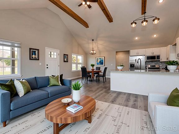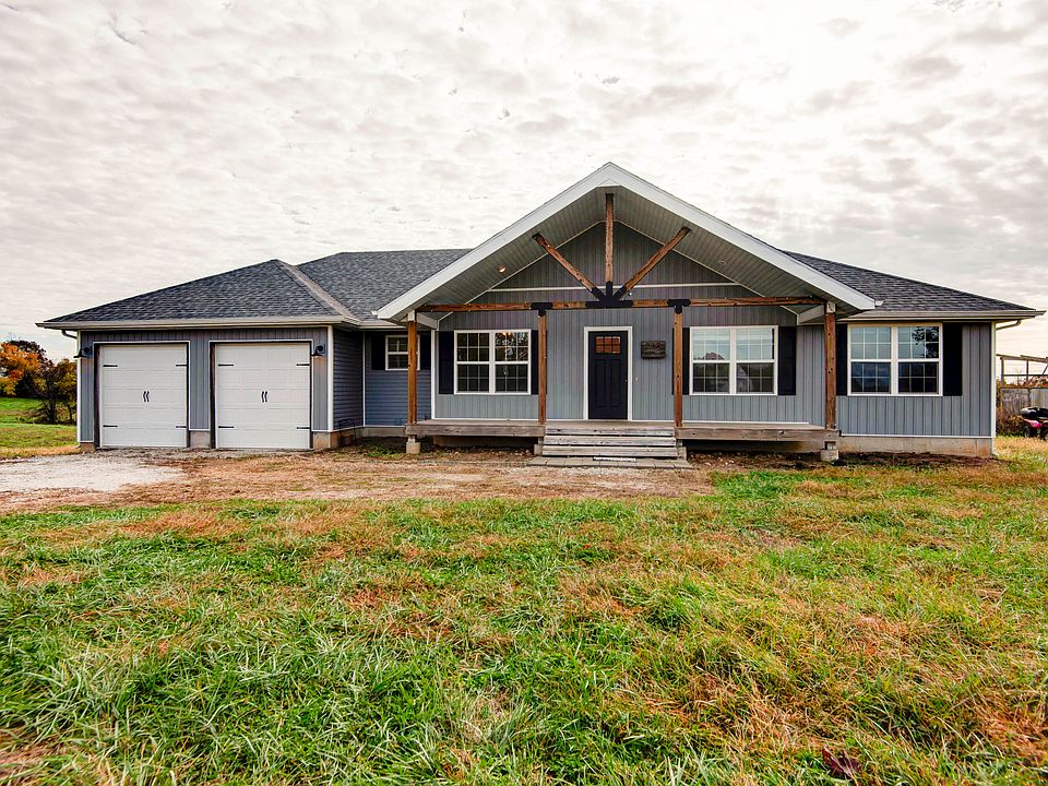 Modern Farmhouse on 5 Acres in Clever Schools! Built in 2020, this beautiful 3-bedroom, 2-bath home offers the perfect blend of modern farmhouse style and peaceful country living. Featuring an open, split-bedroom floor plan with approximately 1,559 sq. ft., the spacious living, dining, and kitchen areas are highlighted by soaring vaulted ceilings with striking wood beams and abundant natural light. The kitchen is a showstopper with white cabinetry, black-and-white granite countertops, a stylish tile mosaic backsplash, and stainless steel appliances. The master suite includes a walk-in closet, dual vanities, and a walk-in shower. Both bathrooms are tastefully designed with contemporary finishes throughout.Enjoy relaxing on the large covered front porch or the back porch overlooking your private 5-acre property--complete with fencing, a pond, and peaceful countryside views. With its modern design, move-in ready condition, and sought-after Clever schools, this home offers the best of comfort and country charm!