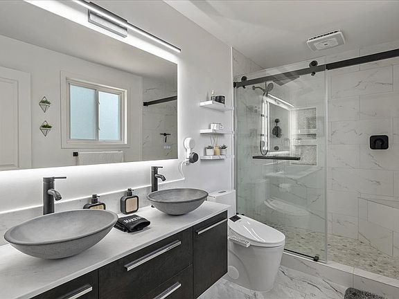 Spacious 1,900 sq. ft. layout with remodeled kitchen, quartz countertops, stainless steel appliances, and bar seating. Includes dedicated office with dual desks and monitors, in-unit washer/dryer, central HVAC with gas heating, forced air, and high-speed WiFi internet. The bathrooms feature a walk-in tile shower, a bathtub, and even a bidet in the master bath for added comfort.