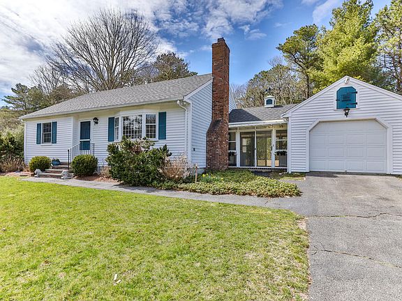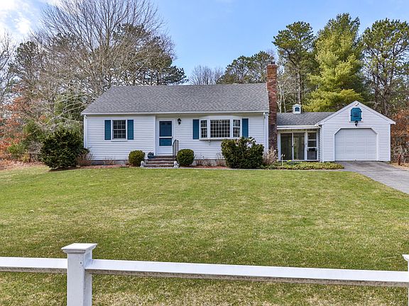 This adorable 2 bedroom 1 bath ranch has been lovingly owned for 35 years , looking for a new family to make memories. This is one of the few houses on the market right now that with just minor cosmetic updates value could be added immediately. Underneath the wall to wall carpets are hardwood floors. The back yard is private and spacious with mature plantings bordering, creating the perfect backyard oasis boasting an outdoor firepit and outdoor shower. A one car garage is attached to a sunny breezeway, leading you into an inviting layout with easy one floor living. A full basement could easily be finished for extra space, or great for storage. Updates within the last 5 years include a new hot water tank and heating system and appliances, central air, new roof, updated electrical and a new garage door. Irrigation out front and professional landscaping contribute to the eye catching curb appeal. Directly across the street is Eagle Pond Cordwood Road Sanctuary offering 182.5 acres of trails and protected land. Customize this Cotuit charmer to make it your dream home on Cape Cod!