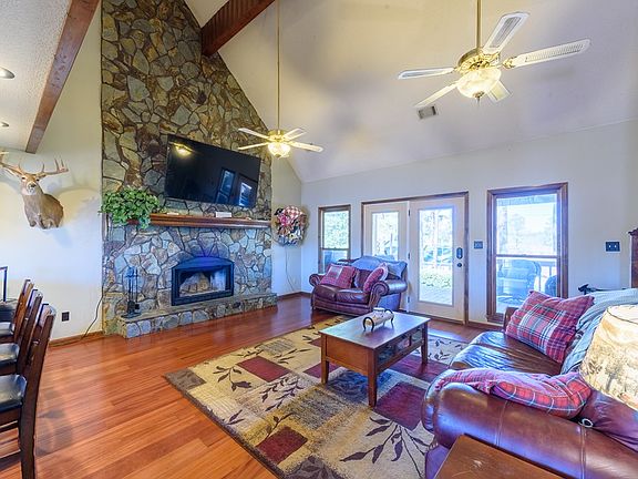 Tucked away on a quiet street, this private 2.5-acre property offers rare seclusion with no neighbors on either side, across the street, or behind the home. This charming two-story residence combines character, space, and functionality in a peaceful, natural setting. The main level features the primary suite, living room, and kitchen with soaring ceilings and a stunning stone fireplace as the focal point. Upstairs offers two additional bedrooms and a full bath, ideal for family or guests. Enjoy outdoor living from the spacious front porch with swing or the newly covered back porch, perfect for entertaining. Steps lead down to a large pond with abundant wildlife, creating a true retreat atmosphere. Additional features include a detached two-car garage, a massive wired workshop, fenced yard, no HOA, and no restrictions—making this property ideal as a primary residence or private getaway.