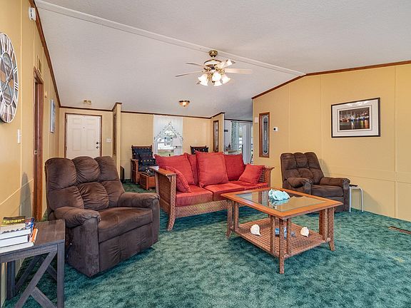 Welcome to your new home, a beautifully updated manufactured property that offers the perfect blend of comfort and modern convenience. Enjoy the pride of ownership with your own land, ensuring complete control and privacy. As you approach, you will be greeted by a spacious driveway and a charming front porch with newly installed steps, creating a welcoming look. Step inside and experience the freshness of brand-new flooring and fresh paint throughout the home, enhancing the updated feel. The large, bright living room invites you to unwind in style, while the generous bedrooms offer ample space for relaxation and personalization. The main bathroom has been completely redone, offering a fresh and inviting space. With newly installed hurricane windows, you can feel secure and protected in any weather. Outdoors, enjoy the benefits of solar panels that will help reduce your energy costs while being environmentally conscious. Plus, the home is equipped with a new rain gutter system, ensuring that your property remains safe and dry year-round. This property is truly a gem, move-in ready and waiting for you to make it your own.