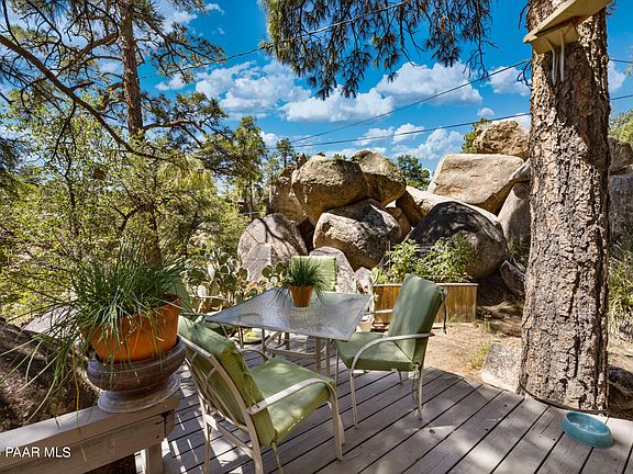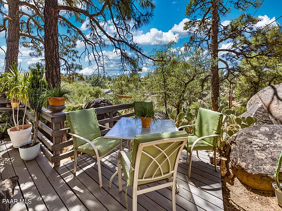 Total privacy awaits you with this fantastic home perfectly situated in the boulders and pines of Prescott located near the Historic World's Oldest Rodeo Fairgrounds. Relax on the front deck sipping your morning beverage with views of the city, Granite Mountain and Thumb Butte. You'll feel right at home in this very well taken care of home, spacious, comfortable open with loads of natural lighting. The living room includes a cozy fireplace and connected dining area. Large kitchen with plenty of cabinets. The family room has an attached sunroom with flagstone flooring and passive solar. Studio/workshop with an attached darkroom has endless possibilities. Full finished walkable attic with access, windows and capped plumbing. All this and walking distance to Prescott's Historic Whiskey Row.