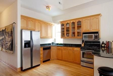 Dramatic & spacious corner unit penthouse condo, 2 bedrooms, 1.5 baths in best West Loop/Greektown location! Enjoy the open 16' ceilings! Open cook's kitchen with 42" cabinets, granite counters, and stainless steel appliances that opens to nice living room with cozy fireplace. Awesome downtown views from east facing windows and deck. Large rear deck. Granite counters in bathrooms, hardwood floors, washer/dryer, ample closet space. Must see. Walk to all: downtown, transportation (2 blocks from Blue Line and 90/94, 4 blocks from Union Station), dining (Greektown and Randolph/Fulton Market), grocery (Whole Foods/Marianos). Parking: street, permit and nearby private garages for rent. Owners pays for water; renter pays for electric, gas, TV/Wifi services