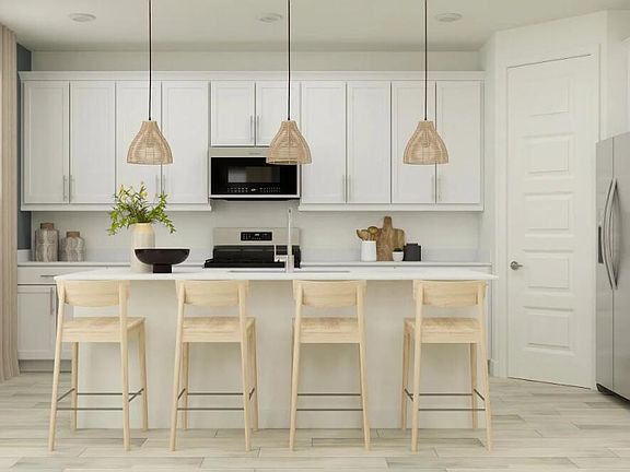 Complete with 7x22 tile flooring, beautiful quartz countertops, and modern maple slate cabinetry. All stainless steel kitchen appliances pictured are included. Photos are of model home.
