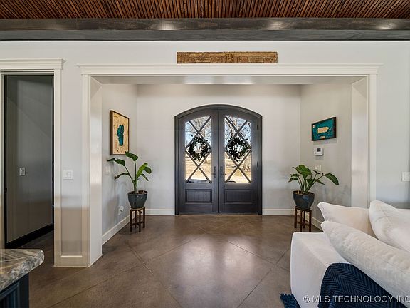 THIS BEAUTIFUL custom, luxury single-story was built with SUCH heart and quality. Sitting on 10 acres with close access to Highway 75 with mature trees in the front and back yards—the property offers such peace and privacy. The exterior of the home features a beautiful low-maintenance OK natural quarried hand-chipped stone exterior, a circle driveway with TONS of parking, exterior lighting on photocell to automatically come on/off at sundown & sunrise, 2 RV pads with full hook-up and separate sewer, and Hikvision Colorvu 8MP 4K cameras. Step into the gorgeous interior through mahogany solid wood double front doors, where the home boasts 10-ft ceilings throughout, with vaulted custom wood beam ceilings in the living and primary bedroom. Extra-large primary features oversized windows for a beautiful sunrise view every morning and a door to access the back patio. The custom primary en suite features an oversized glass steam enclosure shower featuring 3/8" glass, double showerheads, a custom two-person copper soaking tub with copper tub filler and 2 large walk-in closets. The outstanding chef's kitchen includes a 60" Wolf double oven stove with 6 burners and a griddle cooktop, a freestanding 36" wide sub-zero fridge/freezer, 3CM Blue Tempest Quartzite Stone countertops, and wonderful built-ins, and custom features. The thoughtful details and custom features within this home are numerous, making it a home that truly stands out. The 4-car garage has its own amenities as well including work/entertaining space, plumbing, and climate control with 2 Mitsubishi mini splits. The back patio area is the most perfect place for entertaining! You will LOVE the views of the pond! There are SO SO many details to this amazing property! A list of amenities are available upon request.