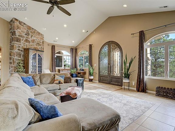 Welcome to nearly 8 private acres in sought-after Woodmen Valley—where mountain views, privacy, and convenience come together. This fully fenced, move-in-ready horse property includes a 3-stall barn with power and water, a fenced grazing area, and the rare benefit of city water—eliminating the hassle of agricultural well restrictions. A circular driveway leads to a grand double-door entrance and into a spacious great room with soaring ceilings and panoramic views. This expansive space opens to a two-tiered patio—perfect for relaxing or entertaining against a stunning mountain backdrop. The gourmet kitchen features granite countertops, stainless steel appliances, a gas range framed by stacked stone pillars, and an oversized island with prep sink for cooking with ease. The ambience of this statement kitchen is further bolstered by rustic wood beams, under cabinet lighting, deck off the dining room for morning coffee, and a cozy hearth area with wood-burning fireplace. The main level offers a private primary suite with a spa-like ¾ bath, dual shower heads, dual vanity, and an oversized converted walk-in closet. A guest powder room and access to the 3-car garage with built-in storage complete the upper level. Downstairs, the walkout lower level has brand-new paint and carpet throughout. It features a large rec room with wood-burning fireplace, a guest suite with private full bath and walk-in closet, two additional bedrooms with a shared ¾ bath, laundry room, and a spacious storage area—ideal for a wine cellar or safe room. Additional highlights include a heated 15x15 workshop, dual furnaces, two A/C units, two water heaters, a newer septic system, and proximity to award-winning schools, hiking and biking trails, shopping, dining, and I-25 for easy access to Colorado Springs or Denver. With its gorgeous mountain and city view, this property is more than a home—it’s a rare opportunity to live the Colorado lifestyle with room to breathe and space to roam. Welcome home.