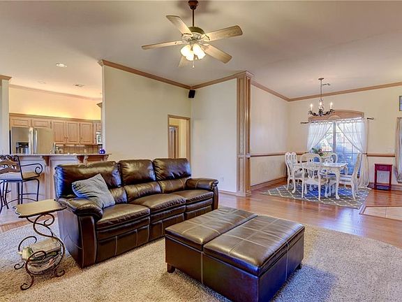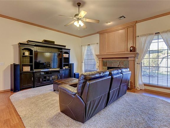 This beautiful home offers tons of space! Featuring a true study with vaulted ceilings and french doors, the home also provides a large formal dining with crown molding and beautiful floors. The living room also includes the same floors, a cozy fireplace with custom woodwork, and more crown molding. It is open to the kitchen that boasts gorgeous granite counters, tile backsplash, pantry, breakfast bar, under cabinet lighting, and a gas range. The master retreat includes a stunning tray ceiling, whirlpool tub with tile surround and fabulous window, double vanities, and double walk in closets. Home also includes a storm shelter, large backyard patio, and brand new roof!