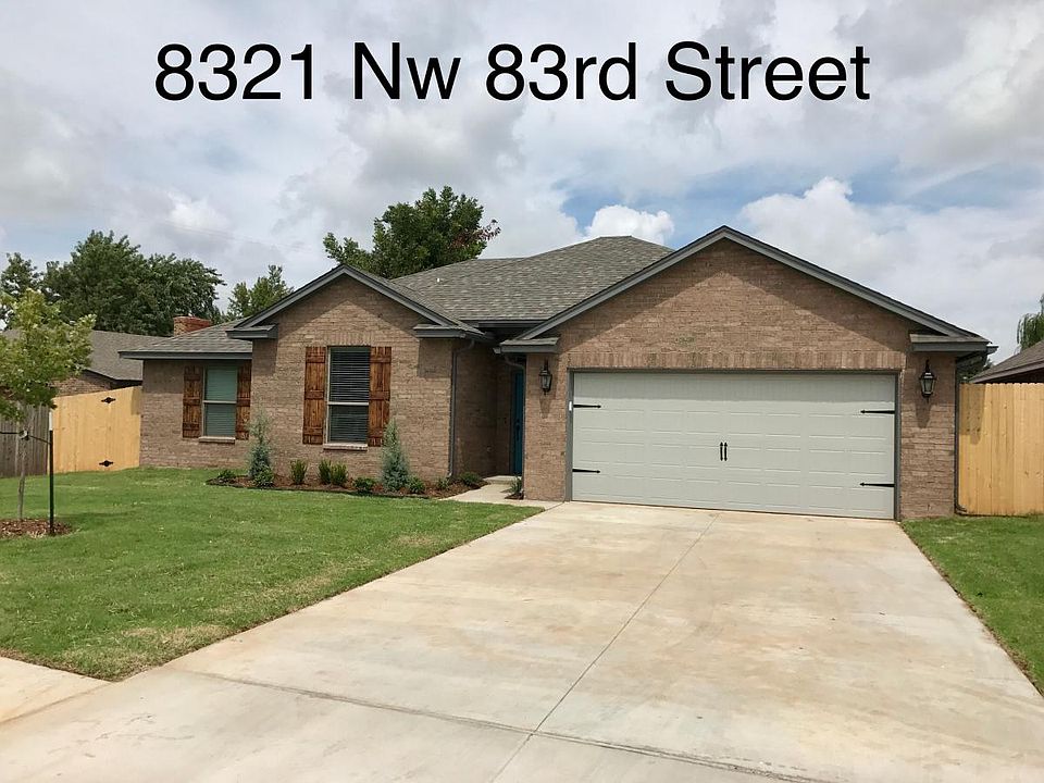 Newly built modern styled high energy efficient home located in the established Aspen Hills addition. Great quiet neighborhood located within walking distance of Wal-Mart, Home Depot and Sams Club with many other amenities nearby. Putnam City Public Schools. Spacious 1,577 sq. ft. 3 bed & 2 bath recently completed in August 2017. Beautiful kitchen with granite counter tops, faux finished island and dining area. Large living room with gas burning stone fireplace. Great master bedroom and spacious master bath with large walk-in closet, double sink vanity, large walk in shower. Nice carpet and lots of ceramic tile throughout. Alarm system. Large fenced backyard with covered porch. HOA provided neighborhood park. This newly built home has been tested per the Home Energy Rating System (HERS) rated at 52 (see chart in photos). High efficiency AC, high efficiency vinyl windows and tankless natural gas water heater. 8321 Nw 83rd Street is locally owned and managed. All applicants 18 years and older must qualify through National Tenant Network and pass credit and background qualifications. A non refundable application processing fee of $30.00 per adult is required prior to application processing. Non smoking premises inside or out. One small dog will be allowed weighing less than 20 lbs with a additional $500 refundable pet deposit. Maximum occupancy for this residence not to exceed four people. Property security deposit must be received in full no later than 24 hours after application approval and or tenant notification. Showings are available between the hours of 9:00AM-5:00PM Monday through Friday. Tenant responsible for all City utilities and yard / lawn maintenance.
