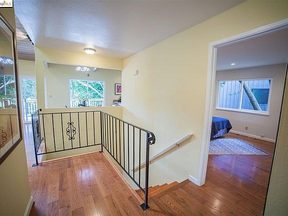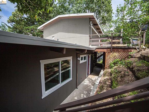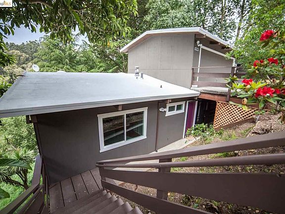 Classic 70's Montclair home with clean, uncluttered lines, wood cathedral ceilings, skylights and flexible uses. Main floor has spacious open living room and dining area open to updated kitchen with breakfast bar, plus 2 bedrooms with ample closets and bath with walk-in tile shower with glass doors. Downstairs features a family room with second kitchen, roomy bedroom and bath with shower over tub. Separate entry lends itself to in-law or guest quarters, shared housing and other possibilities. Both levels have generous decks with peaceful woodland views. Newer wood floors throughout and modern double pane windows. Superb location for hikers, dog walkers, bird watchers, cyclists. Easy access to the East Bay's beautiful parks and trails but still a short drive to Montclair Village.