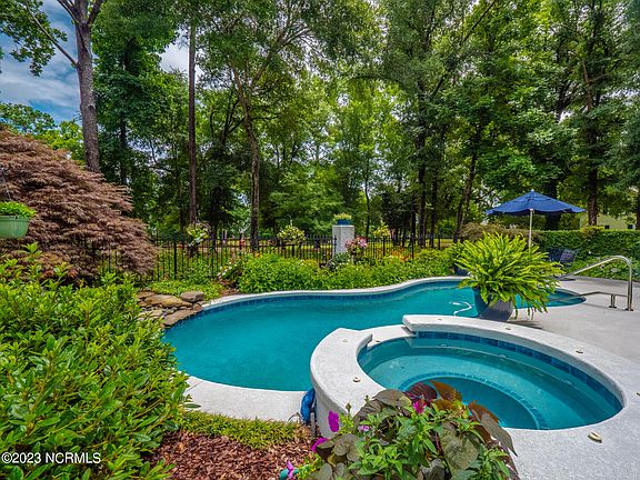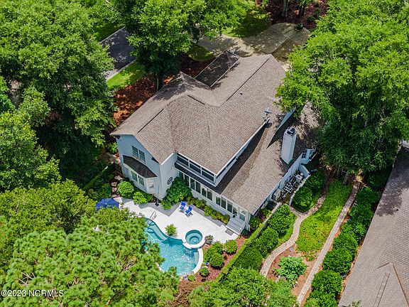 Envision yourself living in this premium location on a large, elevated cul-de-sac lot on the 11th hole of the Tom Fazio golf course in Porters Neck Plantation, within easy walking distance to club amenities. A large, covered rocking chair ready front porch welcomes you into an open floor plan with breathtaking views of the golf course and private backyard oasis featuring mature landscaping, waterfall feature, saltwater pool and hot tub. Entertain in the spacious 4 season sunroom, with dining, kitchen, and the large living room nearby. The first floor also features a master suite with golf and pool views, and an office with built in bookcases. An extended garage area has ample room for a workshop area, and flower arranging station. The second-floor features 3 additional bedrooms, 2 full bathrooms, a sitting area, and a screened in porch with golf course views. Porters Neck Plantation is a gated community with a kayak launch and boat ramp for residents off Bald Eagle Lane. Memberships are available to the country club at an additional expense.