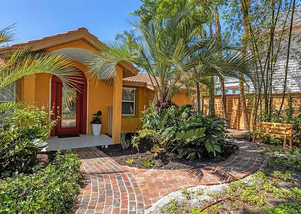 Incredible opportunity for an amazing Siesta Key Oasis nestled amongst mature oaks, palm trees, fruit trees, bamboo and tropical plants located on the Heron Lagoon offering numerous ways to enjoy this tropical paradise! This Old Florida style, fully fenced property would make a great family compound with the main home situated on the Heron Lagoon waterfront with awesome views, mangroves, wildlife, large brick paver patio and a ramp to easily launch a kayak or paddleboard into the calm waters of the lagoon. The main home has a generator hook up plus hurricane panels for all doors and windows. The very cute concrete block front cottage (all electric and separately metered) and smaller in-law/guest suite (tied to the main home for electric) offer an income opportunity as seasonal (30 day minimum) or annual rentals or simply use them for friends or family! The sparkling blue waters of Turtle Beach is just one mile to the south and Crescent Beach is 2 miles to the north. This home and property have been lovingly cared for, upgraded and enjoyed by the current owner and offers many features. Upon entering the main home you walk into a vaulted ceiling entrance with views to Heron lagoon while the open floor plan is also split. Enjoy cooking in this fabulous chef’s kitchen with custom cabinetry, granite, stainless steel appliances, propane powered range with designer range hood that vents to the outside, Mexican style tile floors, tile backsplash and pendant lighting. Spacious living room with stone fireplace powered by propane, hardwood floors, recessed lights and wall of large windows with direct views to Heron lagoon. Huge master bedroom off the living room also has high ceilings and French doors leading out to the Herring bone pavered backyard with hot tub, outdoor shower, fire pit, launch and a dock to the lagoon. The private master bath has a large tiled, step-in shower, dual sink vanity and large walk in closet w/ organizers. There is a whole house water filtration system for the entire property that covers all three homes. There is a carport attached to the in-law/guest suite and parking for 4 cars for use by the occupants of the main house and guest suite plus lots of parking up front for tenants and guests. Optionally, turn the 24’x24’ in-law/guest suite back into a 2 car garage and still have the front cottage for rental or guests. Laundry is located in a detached building and the front cottage has their own laundry. All of this is located on an extra wide 75’ lot and just shy of half an acre. Enjoy this amazing property or build your own dream home on a gorgeous piece of peaceful paradise on Siesta Key. This is a unique and very special property and must be seen and felt to fully appreciate!