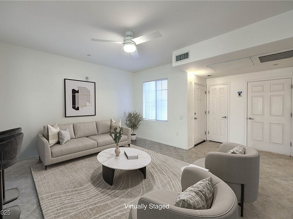 For sale—your hidden gem in Las Vegas! This rare 1-level condo home features 1 bed, 1 bath, and a 1 car attached garage with direct entry. Nestled in a gated community with a community pool, it offers a highly desired location and driving distances between Summerlin and the Strip. Built in 2006, it showcases tile floors in main living areas, plank flooring in the bedroom, stainless steel appliances, and a spacious open great room. Enjoy a large laundry room with cabinets, plus extra storage room off the rear covered patio. Relax in your tucked-away interior located unit within the community. The outdoor rear patio is NW-facing to enjoy a setting of lush landscaping and greenery, situated toward the back of the community; does not back to a street. A stylish, low-maintenance home in a prime Las Vegas spot—don’t miss it!