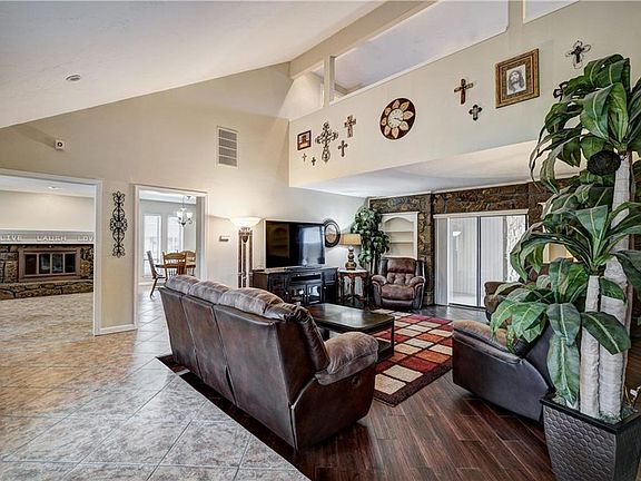 WOW This home has everything! 5 bedrooms, 2 living rooms, 3.5 bathrooms & POOL! Immaculately maintained w/ new flooring, carpet & interior/exterior paint. Main living room is finished w/ wood-tile floors & a vaulted ceiling. Kitchen is huge, w/ tons of storage & counterspace ~ breakfast bar, double ovens, refrigerator, large eating space. Just off the kitchen is a great flexible space ~ 2nd living area or dining area & features a beautiful fireplace. Master suite is very spacious ~ overlooks the pool ~ 2 closets, double vanities, separate shower & bathtub. 2nd bedroom on the 1st level ~ walk-in closet ~ would also make a great study. 2nd floor has an additional huge living room & 3 bedrooms ~ all with large closets as well. The tranquil backyard features a 40,000 gal pool & a private patio to relax. The 3 car garage is fully insulated ~ upgraded storm shelter, workshop & attic space is fully decked. Extra insulation added to home for amazing energy efficiency! Welcome Home!