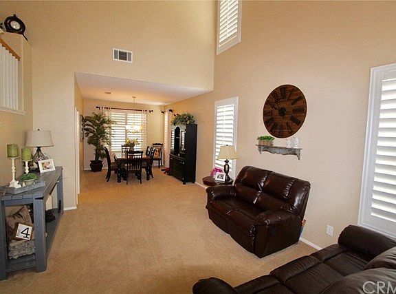 Beautiful 2-story home located in the highly desired neighborhood of Orangecrest. This home is truly turnkey. This 4 bedroom/3 bath home features 18" tile flooring downstairs, ceiling fans throughout the home, recessed lighting and wood shutters in the entire home. Walk into the formal living room that has high vaulted ceilings and then make your way into the dining room with direct access to the kitchen. The large kitchen has plenty of cabinetry, stainless steel appliances and a custom tiled backsplash to accent the walls. The family room features a fireplace with a custom mantle and an entertainment system cut-out to hold your large TV. Down the hall near the stairs you find the only bedroom downstairs. There is one guest bathroom downstairs that has a shower for those overnight guests. The separate laundry room is downstairs and near the garage exit. Upstairs you will find a huge loft/game room that is perfect for children or enjoying a family movie night. You will find two more spacious bedrooms and a dual vanity sink bathroom with a separate shower. Make your way into the large master suite that features double doors, his and hers large walk-in closets, separate shower and bath tub and dual vanity sinks. This home has a large backyard with room to build a pool. The home has a covered alumawood patio, a dog run on one side of the home and a block wall planter. This home is in walking distance to schools, churches and shopping. Close to the 215/91/60 freeways.