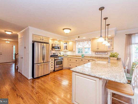 Prepare to fall in love with this charming 3 bedroom 2.5 bath home perched on a large corner lot. A covered front porch welcomes you in to find a gracious foyer with hardwood floors that extend throughout the sunny eat-in kitchen featuring stainless steel appliances, sleek granite counters, timeless cabinetry, recessed lights and peninsula breakfast bar with on-trend pendant lights adjacent to a spacious dining area with access to backyard with concrete patio and 2-car parking pad. Light-filled family room off kitchen provides the perfect place to gather and features a cozy gas fireplace. Main level also features a private study with French doors, ideal for working from home. Upper level hosts comfy bedrooms each with ceiling fan and custom closet, including the owner's suite boasting a generous walk-in closet and attached full bath with jetted tub, walk-in shower and double vanity. Full, finished walk-up lower level features new waterproof vinyl plank flooring, plenty of space for recreation and relaxation as well as laundry room with lots of storage space. Great location with convenience to commuter routes and everyday needs. Welcome home!