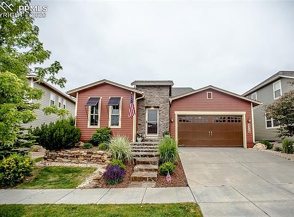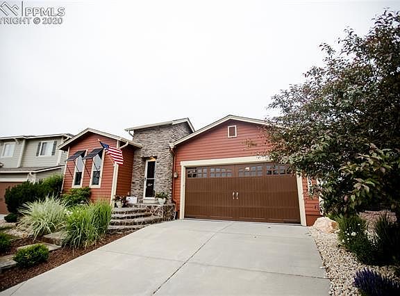 Exceptionally maintained rancher in Wolf Ranch with Amazing Views! Pike's Peak and the Front Range is beautifully displayed in your own backyard! Open space behind the home assures the view will remain unobstructed! Main level living area features wood floors and great room has vaulted ceilings with beautiful decorative wood trusses, and multiple windows allow light to flood in and illuminate the whole main floor. The living space flows seamlessly into the dining area and kitchen. The kitchen features granite slap countertops, an island with bar-seating, a butlers pantry, walk-in pantry, as well as stainless steel appliances. The dining space offers a walk-out to the backyard and amazing custom patio with built-in gas grill, perfect for entertaining. The main level also features three bedrooms, a separate laundry room, a full bathroom, garage access, and basement access. Basement has fourth bedroom, large family room with built-ins, and ample storage space!! Near walking paths, schools, shopping and recreation along the Powers Corridor and more! Don't miss this amazing home!