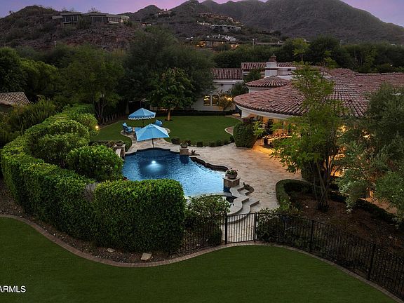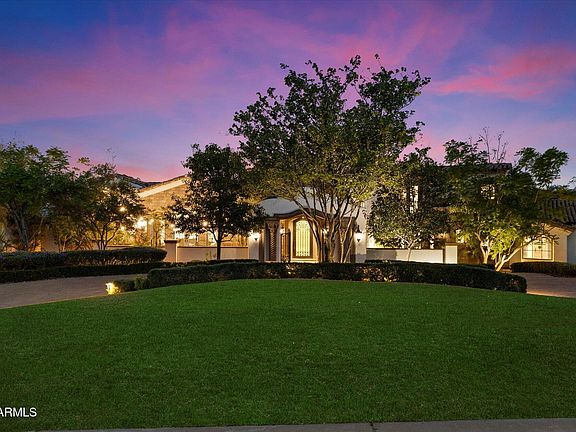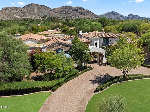 This stunning Spanish inspired Santa Barbara estate captures timeless elegance and breathtaking mountain views. Designed for both intimate family gatherings and grand scale entertaining, the open concept floor plan flows seamlessly from the inviting and cozy family room to an expansive outdoor living space, complete with tranquil fountains, dramatic fire features and lush landscaping. The primary suite is a luxurious retreat, featuring a private flex room ideal for exercise/ nursery or office as well as a spa like bath with a steam shower. Two secondary bedrooms on the main floor share a versatile study,play,TV area., Two more bedrooms with a bath are upstairs, each with its own outdoor patio. A beautifully appointed attached guest casita offers its own kitchen, bedroom, living space and full bath. Additional highlights include a theatre room with plush seating for Friday movie nights or weekend streaming marathons, a garage with spaces for 7 cars, and a dedicated workshop. The overall feeling is elegant and comfortable with perfectly balanced design, refined architectural detail and yet livable for a modern family. This is Paradise Valley at its most sophisticated- where every detail is designed for comfort, beauty and family. This home is built for every moment- quiet mornings, lively dinner parties and everything in-between.