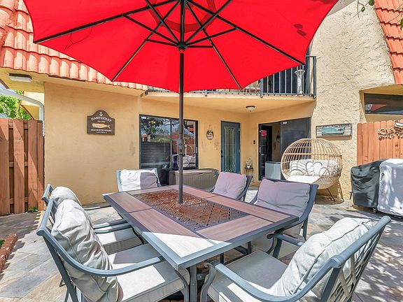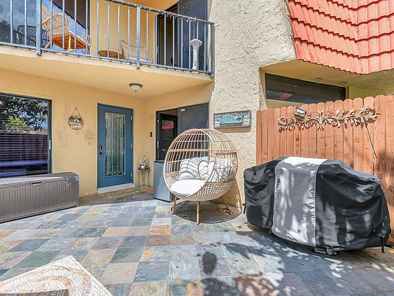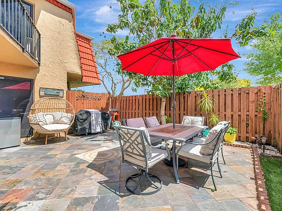 Beautiful townhome located in the desirable community of Boca Rio. This lovely 2 bed, 2.5 bath townhome with 1,302 sq feet of living space is packed with delightful features. Step inside to find neutral tile floors throughout the main living areas. The kitchen boasts white cabinets, newer stainless steel appliances & plenty of counter space. Powder room & laundry are conveniently located on the 1st floor. Upstairs, the primary suite has 2 closets, including a walk-in & ensuite bath. The 2nd bedroom has an ensuite bath with walk in shower. Charming balcony accessible from either bedroom. Brand new impact front door, A/C 2023, roof 2022. Private fenced in patio with upgraded flagstone pavers, mango tree & extra storage closet offers plenty of space for entertaining & relaxing. Welcome Home!