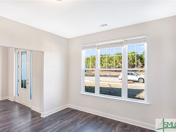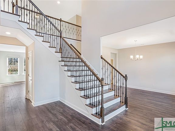 The Sapelo plan by Smith Family Homes is under construction in McAllister Pointe with an estimated completion date of September 2024. This floorplan features an open concept kitchen and living area, a powder room, an office/flex space, and a guest room with a full bathroom downstairs. The owner's suite upstairs features a sitting area, two walk-in closets, and a spacious bathroom. Two additional bedrooms plus a media room are found upstairs. Model home images shown; to be similar but not identical.