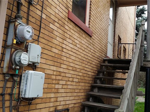 833 Kirkpatrick property has two separate gas meters, two hot water tanks, two operating furnaces, and separate exterior entrance to the upper floor. Municipal record shows zoning as single-family residence.