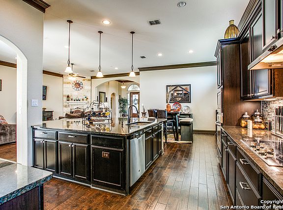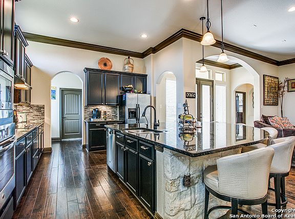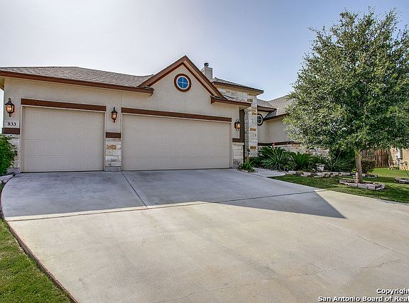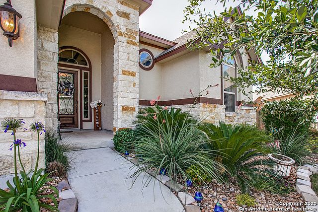Gorgeous one-story 3 bedrooms, 2.5 baths home located in the coveted Mesa at Turning Stone. The only neighborhood with controlled access on FM 1103. Stainless steel appliance package, beautiful granite countertops in kitchen and the main suite, island, 42" cabinets with soft close mechanism in kitchen and laundry room, built in desk to the right of the kitchen, tile and wood throughout and carpet in bedrooms, wide crown molding added in main areas and main suite, family room wired for surround sound and many more upgrades so come by to see. Nestled in a cul de sac and a greenbelt for extra privacy. While sitting on your covered patio, decide where to create your pool oasis in this huge backyard! Refrigerator is negotiable. Less than 2 miles from Interstate 35, close proximity to Walmart, HEB JBSA Randolph and downtown Cibolo.