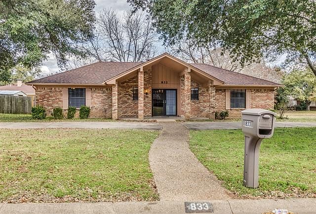 3 bedroom 2 bath home with very desirable split bedroom floor plan located on corner lot. Large living room with brick fireplace with mantel and dining room with french doors open up into an oversized back yard with privacy fence (new fencing on one side and back), perfect for entertaining guests. Roomy master bedroom, lots of closet-storage space throughout the home. The front yard has large trees. Backyard pecan trees, gazebo, workshop, swiss cedar built office shed, and circular concrete walkway.