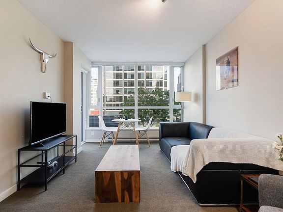Welcome to THE CAPITOL by Wall Financial centrally located in the heart of Downtown Vancouver! This fabulous 1-bed/1-bath boasts 628 sqft of living space feat. a Chef's kitchen w/integrated S/S appliances incl. a gas cooktop, quartz countertops & a breakfast bar that opens to a spacious living room. Plenty of in-suite storage in the Flex Room or make this the ideal work from home office. This home also feat. a large bedroom w/Walk-In-Closet & a covered balcony. The Capitol offers concierge service, 4 high speed elevators, fitness room & rooftop courtyard w/social lounge. Location is amazing w/steps to restaurants, shops, cafes, bars & entertainment & all the city has to offer! Impressive "100" TRANSIT, "100" WALK, "86" BIKE SCORES! Only 5 mins from 2 Skytrain Stations. Rentals & pets ok.