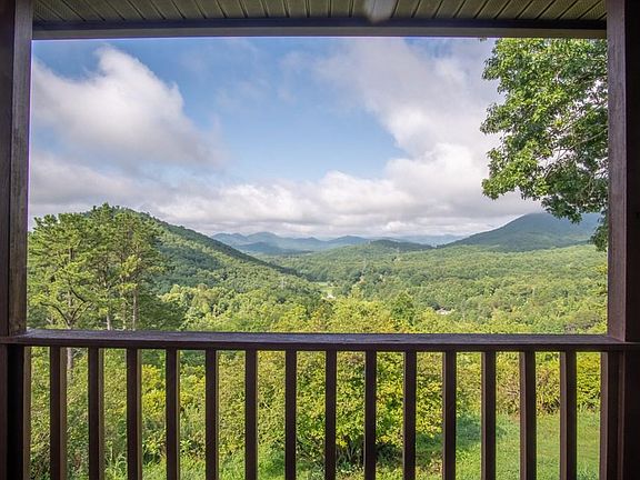 INCREDIBLE VIEWS from this Mountain Cabin. You would never know this mountain paradise exists as it's privately tucked away at the end of the road among the blackberry & blueberry bushes, grapevines, pear & fruit trees. As you drive up and turn the final corner, you will immediately see THE VIEW! That same view can be seen from the wall of doors in the living room, the kitchen, primary bedroom/bath and the guest room. The wrap-around covered deck is where you will likely spend a lot of your time enjoying the 180 degree views and beautiful western NC weather. This space is ideal for entertaining or enjoying your peaceful morning coffee. Living room, dining and kitchen are all open concept with a den off the living room that could double as a main level bedroom. Stairs in the living room lead up to the bedrooms; double masters as both bedrooms are oversized and have large closets and en-suite baths. Great natural lightening and views throughout the home. Original garage and laundry room were converted into a large family room/game room with a two car garage built on as well. If you're into gardening, the infrastructure is already in place with vegetation and beautiful landscaping.