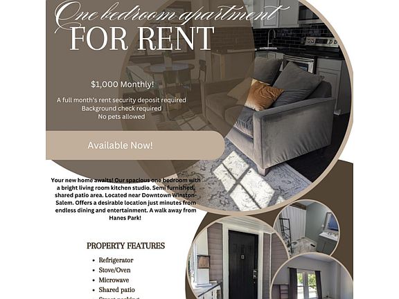 Our spacious one bedroom with bright living room kitchen studio. All Utilities Included. Semi furnished shared patio. Located near downtown Winston Salem! Offers a desirable location just minutes from endless dining and entertainment! A walk away from Hane's Park, RJ Reynolds high School and Wiley Middle School! Atrium Health Hospital down the road! Great coffee shops nearby. Minimum credit score of 650 required. No evictions on record , Landlord won't make any exceptions to those requirements