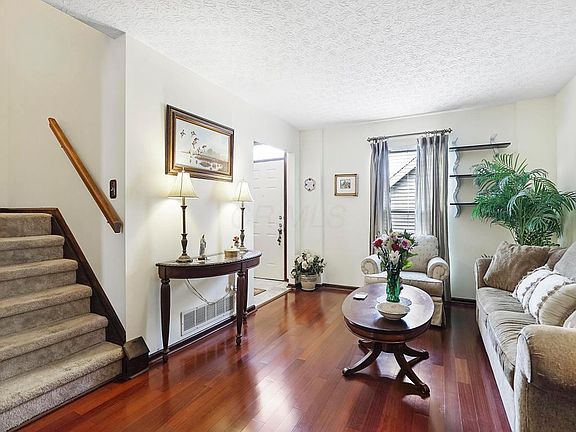 Beautiful 2 story fee simple condo in Worthington Schools with Columbus taxes. This 2 Bedroom, 2 1/2 Bath townhome has a finished basement with woodburning fireplace, closet and a full bath. Lower level laundry room with shelving. Gorgeous hardwood floors on main level. 2 generous sized bedrooms including vaulted ceiling in owner's suite. Ceiling fans in both bedrooms. Granite countertop in kitchen.TV in kitchen stays. Great deck & patio area with water feature. End unit provides large back & side yard. You own the land. Updates include: Furnace & AC 2018, Windows, blinds & outside shutters 2018, Replaced back door 2017, water heater 2017, updated bathrooms 2017, carpet 2014. First American Home Warranty in place $420.00.