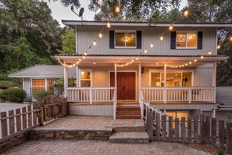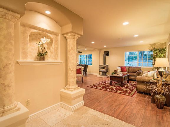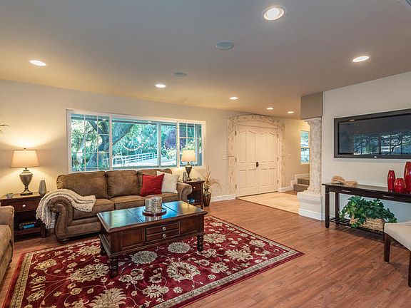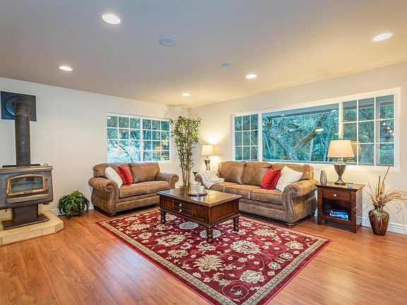 Spacious family home tastefully remodeled with office, attached studio, landscaped outdoor living areas and room for 4H projects or horses. Main home is 1,792 SF with 4 beds plus office and 3 baths. Permitted attached studio is 377 SF with full bath for guests or possible rental, completing the home's 2,169 SF. New gourmet kitchen with custom solid wood cabinetry, granite counter tops, farm sink, pantry, high end stainless steel appliances. New paint, carpet and laminate floors throughout home. All main house bathrooms newly remodeled with custom tile and elegant features. All new windows look out to the lovely 3.42 acre lot studded with oaks, 11 mature fruit trees,aviary,garden boxes,synthetic lawn and fenced play area. Enjoy the serene outdoor living with new redwood deck and extensive patios perfect for gatherings and entertaining. Home has brand new furnace, 2yr old AC unit, water softener and wood burning stove. New high end spa, front load washer and dryer also included.