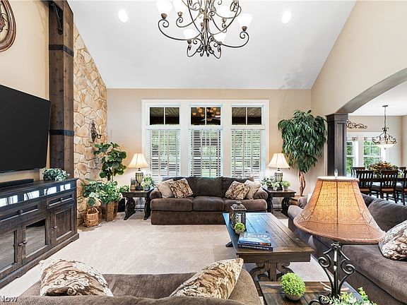 - Description: Cathedral ceiling with beams and wrought iron straps.,Flooring: Carpet