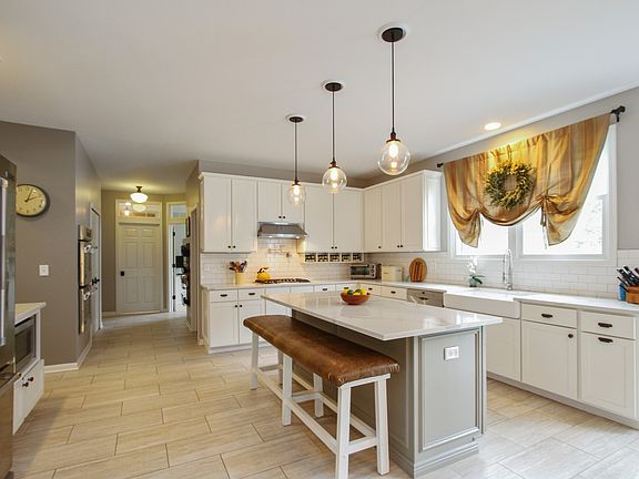 This brick home has been lovingly updated. You'll love the bright new kitchen with big island, quartz counters, tiled backsplash and built-in Bosch and JennAir appliances. There is a walk-in pantry plus a butler's pantry that joins the kitchen to the formal dining room. The 2 sided gas fireplace warms the formal living room and family room. The sun room opens out to the paver brick patio. There is an office on the main floor that could be bedroom with a full bath adjacent. A split staircase leads up to 4 bedrooms. The master suite has tray ceiling, dual closets and totally remodeled bathroom. The guest bath and first floor full bath have been completely remodeled with Kohler fixtures, Restoration Hardware lighting and tiled tub surround. The main floor has all new flooring. The home is on over 1/2 acre with a full basement and 3 car side load garage. The roof and furnace are only a couple years old. Just move in and enjoy.