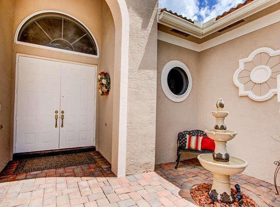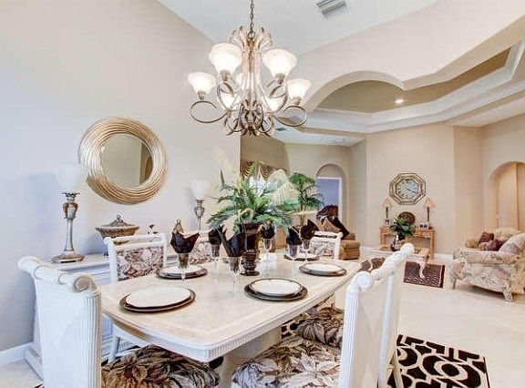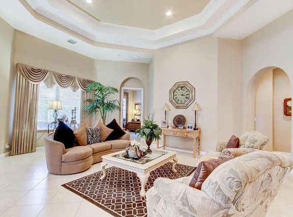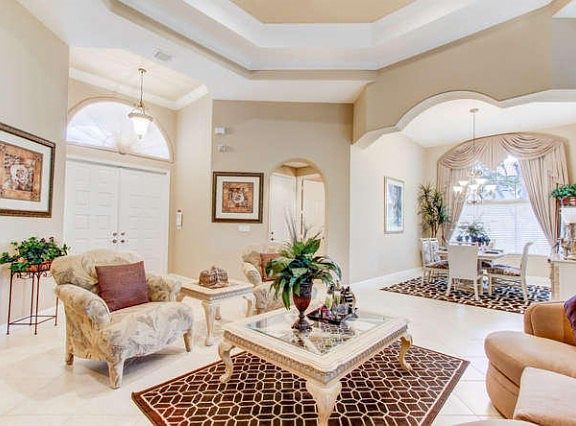 This meticulously maintained home is just waiting for its new owners. Upon entering the double doors you will be standing in the grand living room boasting 18'' tile set on a diagonal, soaring 14' ceiling with two tier octagon ceiling detail complete with crown molding, & recessed lighting. A large picturesque window adorned with custom drapery and full view of your outdoor lanai. Living room is open to formal dining room with arched ceiling detail & 14' ceiling with crown molding, beautiful over sized chandelier & large window with custom drapery. Perfect for entertaining!! Gourmet kitchen features 12' ceilings with crown molding 42'' bisque color cabinetry complete with crown molding, two glass accent cabinets and built in custom pull out drawer features. More at the bottom of the page
