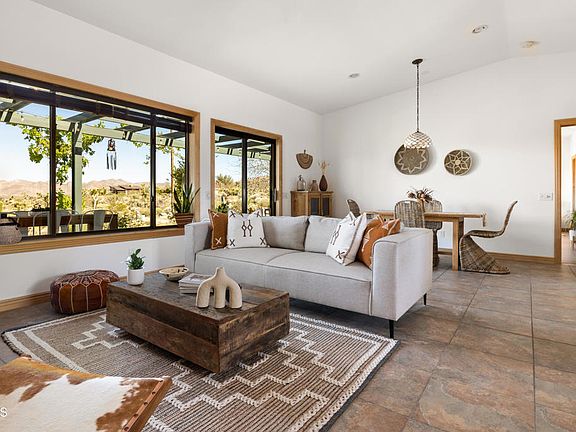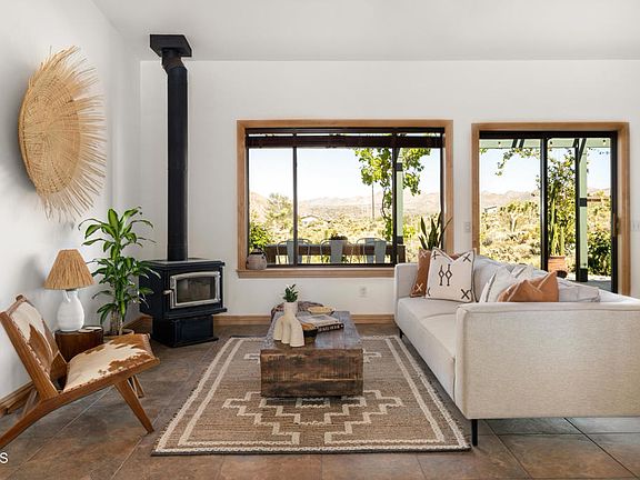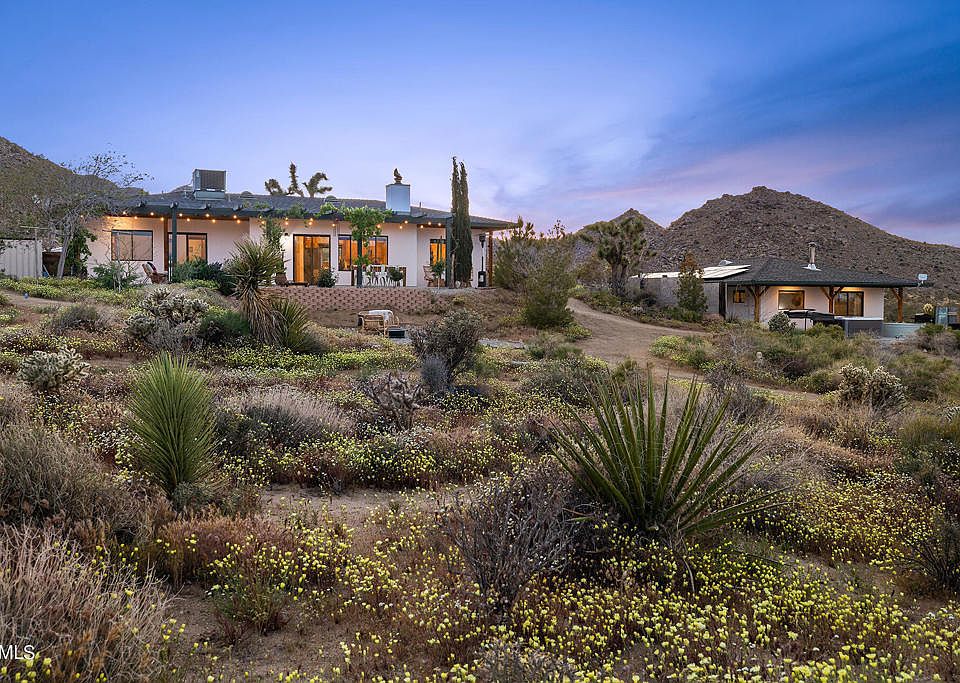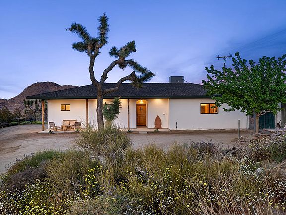 Your search for the perfect Joshua Tree sanctuary is over. 8331 Sunset Rd sits on five acres just a few minutes from Joshua Tree Park, with a wildlife preserve on one side and seemingly endless views from all angles. The main home has a Santa Fe inspired contemporary design, coated in smooth stucco and lined with broad picture windows that show off the ethereal desert landscape all around. Two en-suite bedrooms with luxe baths sit at either end of the home with open concept living space between them extending outdoors onto the spacious pergola-covered patio. Quaint signage points you to the studio Casita just downhill from the main house; it has a kitchenette, bath, hot tub, stock tank pool, and an attached finished garage - currently being used as a lounge - that could be combined with the Casita for even more living space. For the most enchanting moment of all, follow the signs down to your own personal Yurt. With AC, heat, electricity, and a kitchenette, the yurt is cozy and peaceful in its intentional isolation. Each structure boasts its own outdoor space, and the yurt also comes with a funky outdoor bathroom - complete with electricity and hot water. The opportunities here feel infinite- rent the whole place as a short-term or long-term rental, live full or part time in one structure and rent the others, use them as studio space, make this your company's getaway or a family compound for multiple generations; or spend a lifetime here exploring all the avenues this magical retreat has to offer.