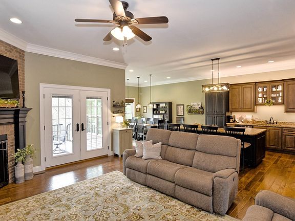 Welcome home to this stunning 2,000+ sq ft Craftsman-style masterpiece located in the desirable Heartland Crossing neighborhood on Evansville's westside! Perfectly situated near USI, shopping, and dining, this meticulously kept 3-bedroom, 3-bath dream home offers custom finishes and timeless charm. Step inside to find exquisite craftsmanship, including hardwood flooring, doors, and trim by Fehrenbacher Wood Specialties, paired with custom cabinets throughout by Fehrenbacher Cabinets. The inviting living room features a gas log fireplace and seamlessly flows into the eat-in dining area and gourmet kitchen, complete with granite countertops and Whirlpool appliances. The split bedroom design provides privacy, with two bedrooms and a full bath on one side, and the luxurious primary suite on the other. The primary suite boasts a spa-like ensuite with a freestanding tub, custom tile walk-in shower, double vanity, and a spacious walk-in closet. The finished basement is perfect for entertaining, offering a large living space, additional storage, and a third full bath. Outside, the covered patio overlooks a peaceful wooded landscape, perfect for relaxing or entertaining guests. Bonus features include a whole-house Generac Generator, ensuring comfort and convenience year-round, irrigation system, and security system with cameras. This home truly combines luxury, functionality, and charm in one unbeatable package!