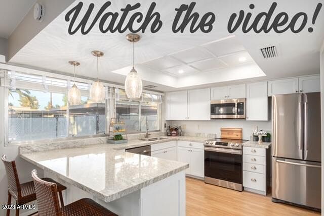 This end-unit across from the pool is located in Chateau de Vie. Charming interior with wood-look flooring and a spacious living area perfect for entertaining. The eat-in kitchen features quartz counters, white cabs, pendant lighting, sleek SS appliances, and a breakfast bar. Primary bedroom, showcasing a walk-in closet and a private bathroom. You'll enjoy quiet afternoons in the backyard with a patio, a mature fruit-bearing tree, a storage shed, and access to the alley. Community features including a rec center, a pool, and well-maintained common areas. Great location a few minutes away from Chapparal Park.