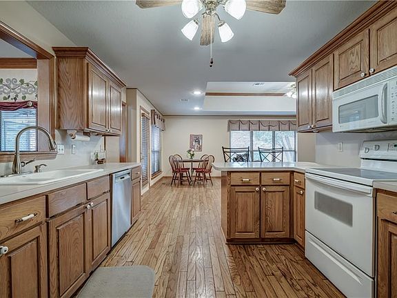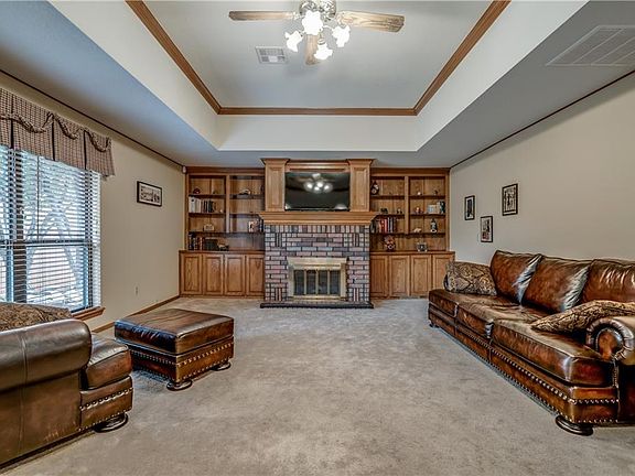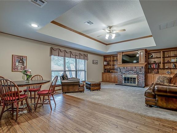 This home's classic curb-appeal is sure to win you over! Immediately upon entry, you will notice the beautifully stained crown molding that runs throughout the house. Spacious living and dining rooms are ideal for entertaining. Beautiful hardwood floors in the kitchen and breakfast nook add to the classic charm of the home. A cozy den showcases a brick fireplace surrounded by built-in bookshelves. The primary suite features double-vanities with plenty of counter space, large tub, beautiful walk-in glass shower, and an abundance of storage. Each of the additional three bedrooms boasts large rooms with closets to be desired. An oasis-like backyard provides lovely landscaping, covered decking, and plenty of green space for the perfect escape. Other perks include all new windows in 2019, new commercial hot water tank in 2018, new dishwasher in 2016, no HOA, and a storm shelter. Don't miss out!